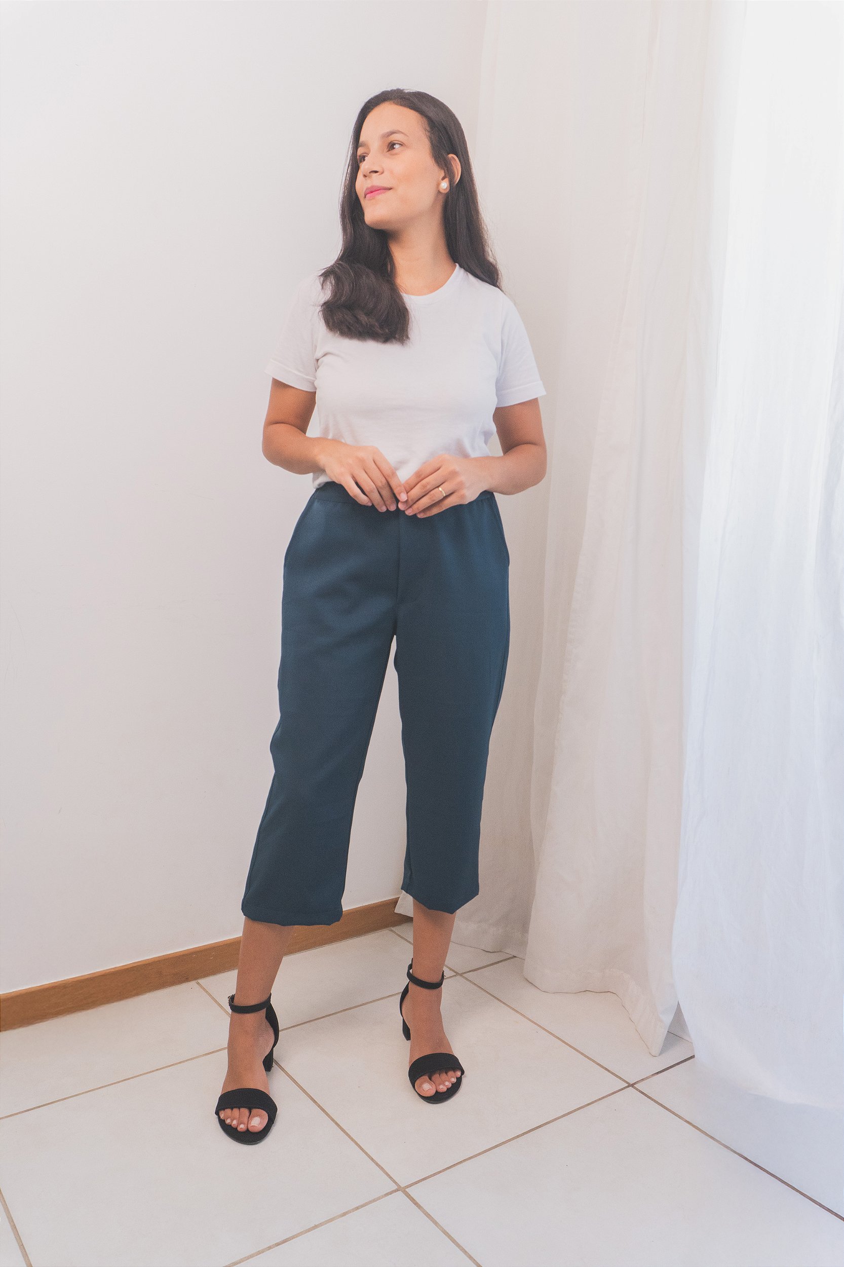 A modelagem pantacourt une o conforto de uma calça ampla ao charme da barra encurtada, criando um caimento fluido e marcante. A cintura alta alonga a silhueta, enquanto o elástico nas costas garante ajuste confortável ao corpo. O toque final fica por conta da garguilha falsa, um detalhe sutil que adiciona sofisticação à peça.